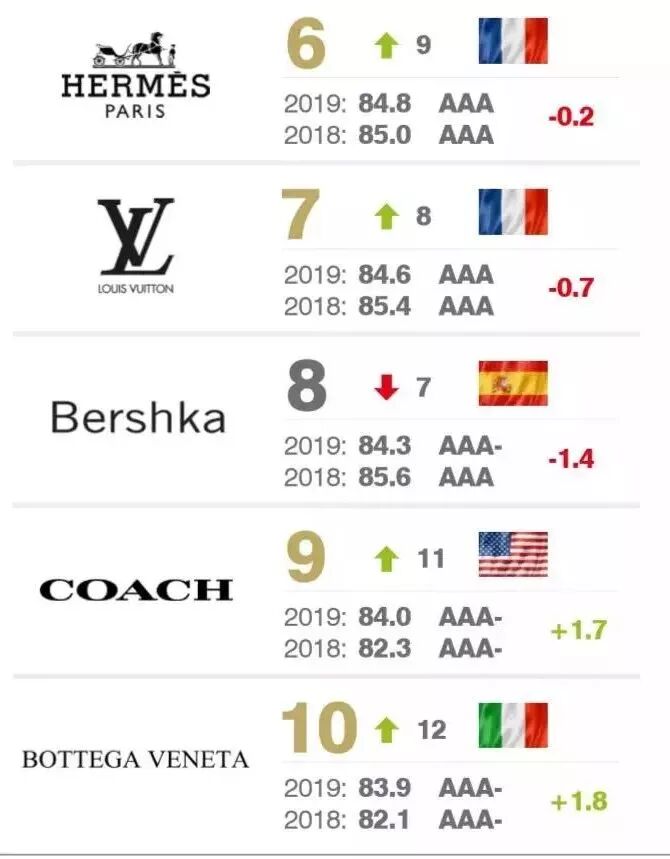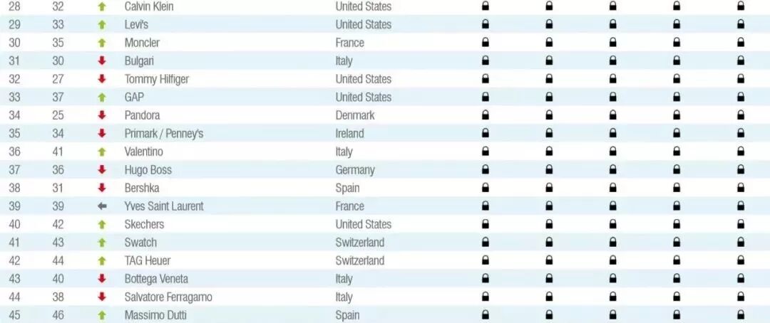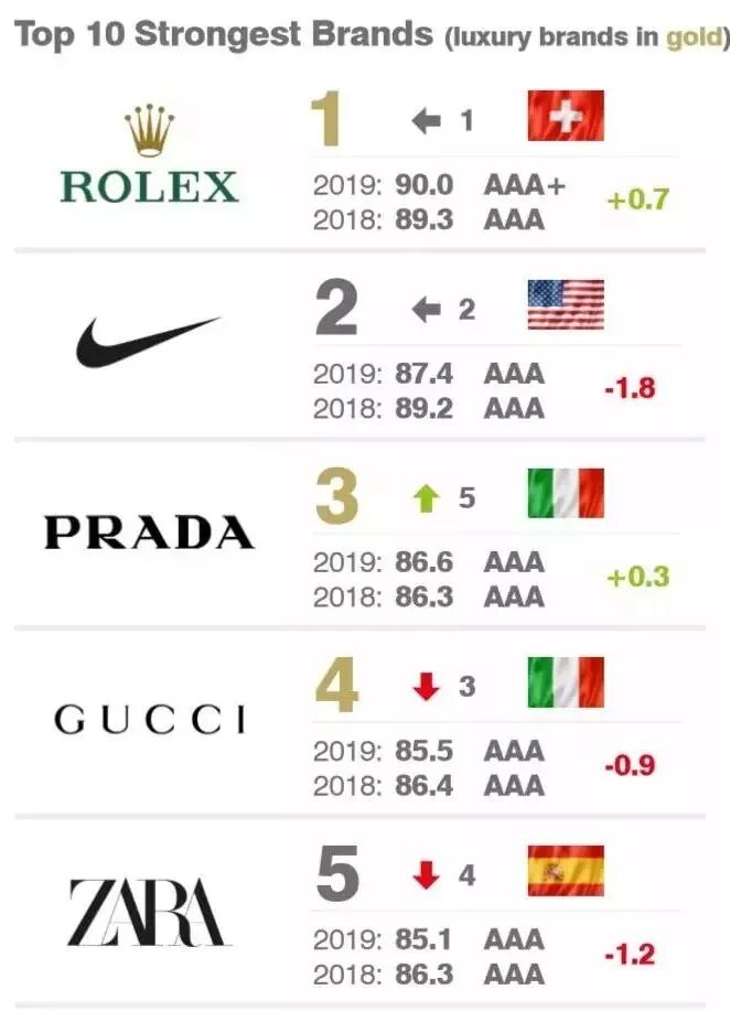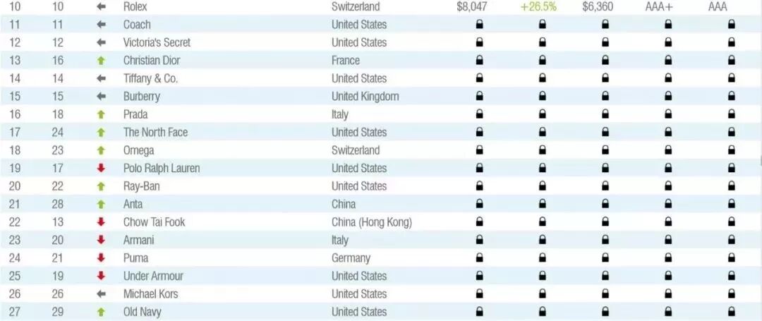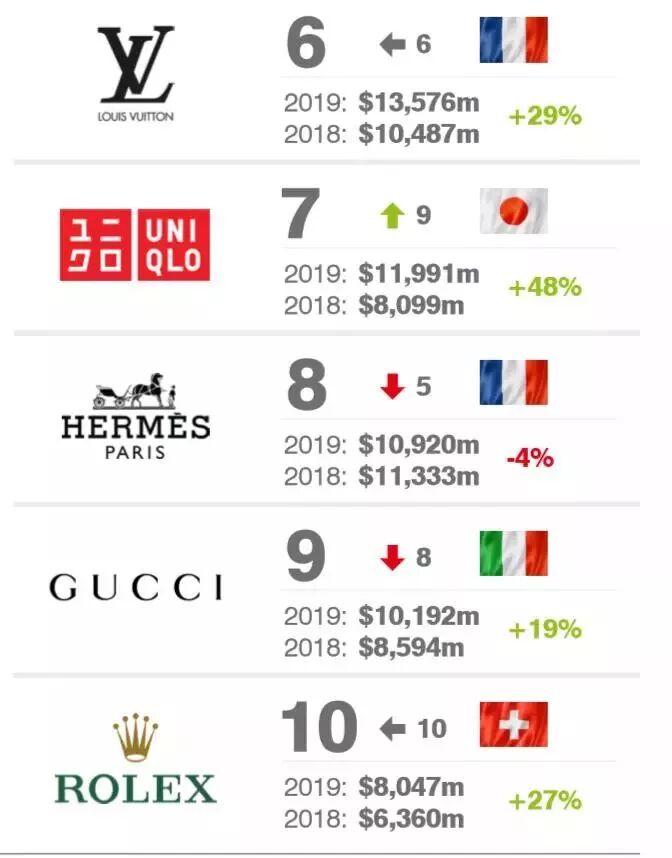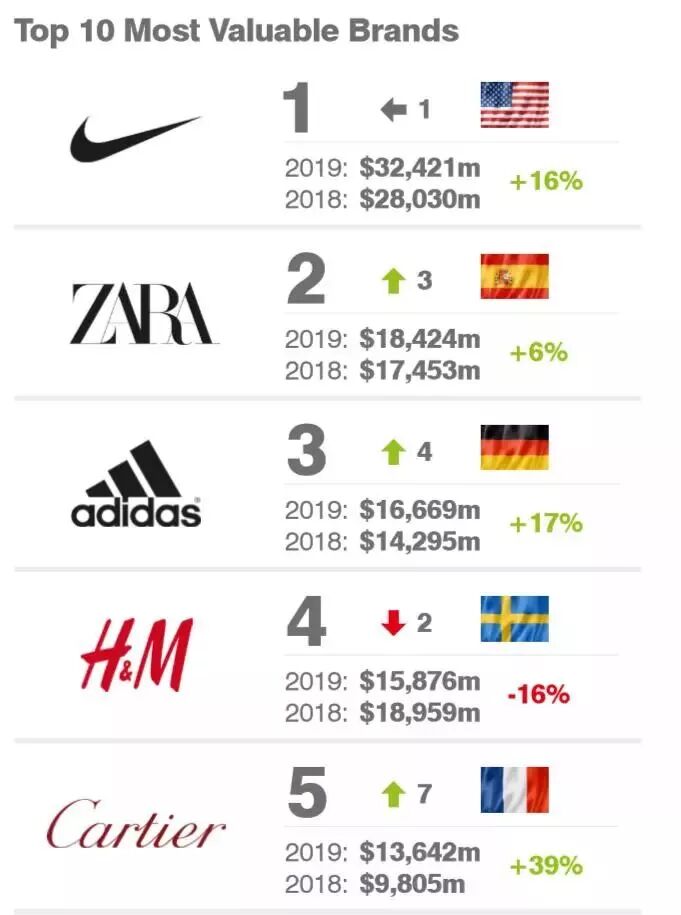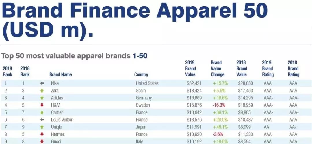 运动品牌 Nike 以品牌价值 324亿美元 蝉联第一。Zara 和 adidas 名列第二、三位。H&M跌落至 第四位,优衣库则是前十名中增速最快的服装品牌,同比增速高达48%。中国的运动品牌安踏和珠宝品牌周大福分别排名 第21 和 第22位。
